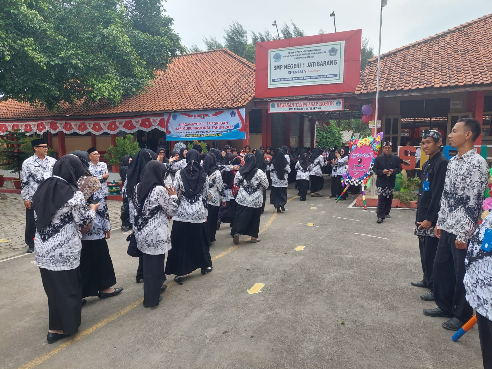 Upacara berjalan lancar dan khidmat sebagai inspektur upacara PJ Bupati Brebes, Bapak Urip Sihabudin, SH.MH, dengan petugas upacara Bapak/Ibu guru perwakilan dari seluruh sekolah di kecamatan Jatibarang. Selesai upacara dilaksanakan, para peserta upacara dengan diiringi oleh grup calung dari SMP Negeri 1 Jatibarang menuju ke Ponpes Darussalam untuk melanjutkan acara sarasehan di pondok pesantren dibawah asuhan Abuya Syekh Soleh Bassalamah. Perjalanan menuju tempat sarasehan para peserta upacara mendapatkan kenang-kenangan berupa bunga-bunga merah dari para siswa, sebagai ungkapan terima kasih yang tulus "Selamat Hari Ulang tahun PGRI ke-78 dan Hari Guru Nasional Tahun 2023".