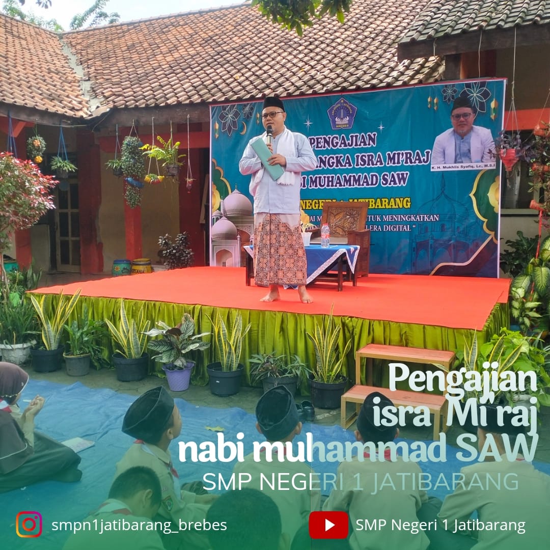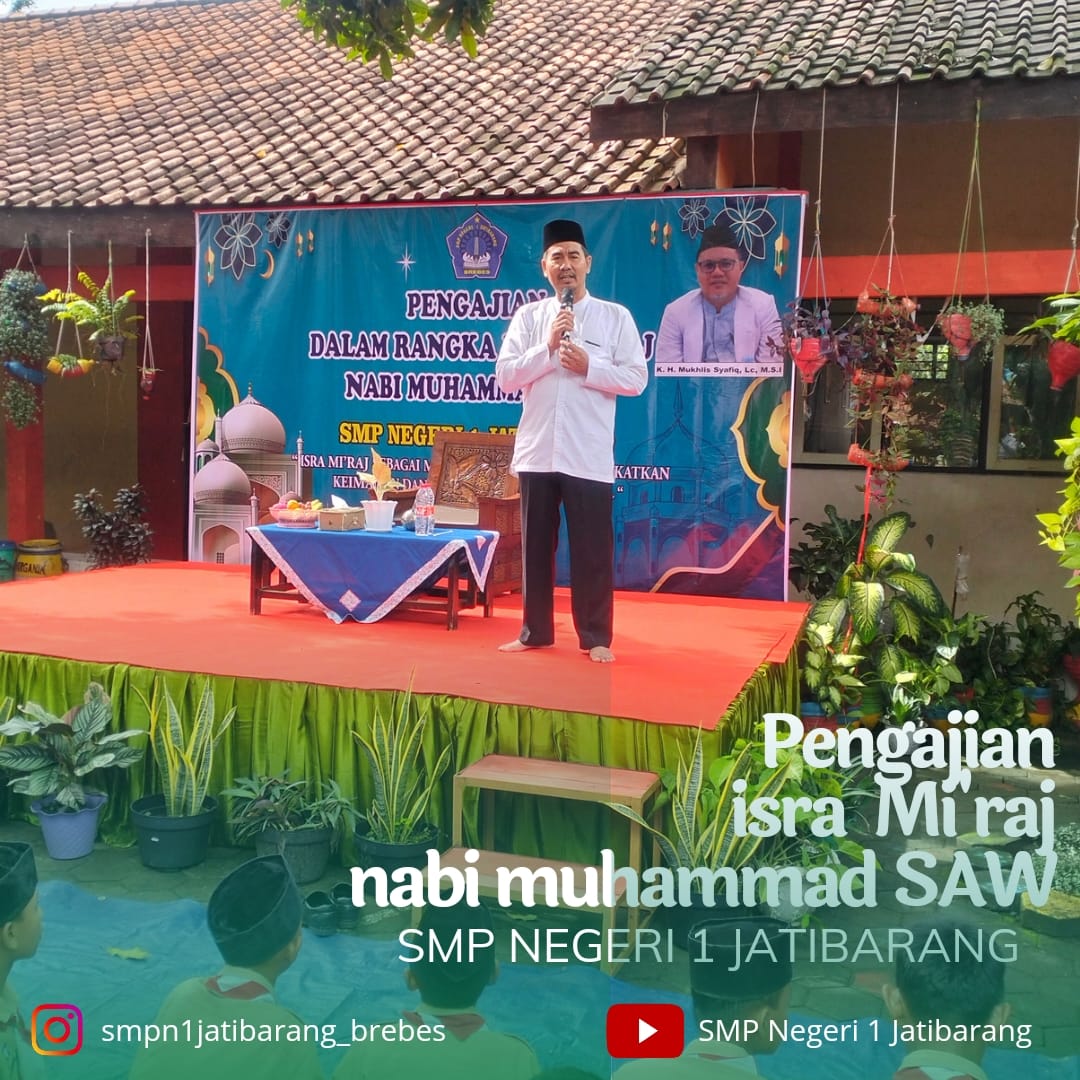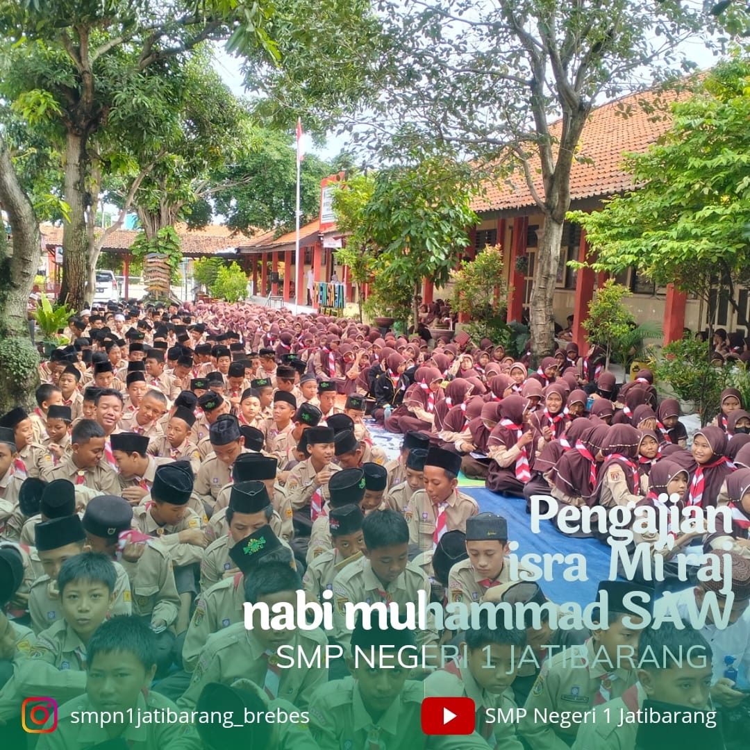 Rabu, 7 februari 2024 SMP negeri 1 Jatibarang Brebes mengadakan Pengajian dalam rangka Isra' Mi'raj Nabi Muhammad Saw 26 Rajab 1445 H / 7 Februari 2024 M, dengan tema "Berbagi momentum untuk meningkatkan keimanan dan ketaqwaan diera digital". Sebelum acara dimulai terdapat pra acara yang diisi oleh penampilan Asma Ul Husna dan Hadroh oleh siswa-siswi SMP Negeri 1 Jatibarang, Brebes. Sambutan Kepala SMPN 1 Jatibarang Brebes Bapak H.Murtado, M.Pd, Beliau berharap siswanya menjadi pemuda dan pemudi yg sukses dan Kegiatan ini membawa manfaat, keberkahan dan rahmat kepada semua keluarga besar SMP negeri 1 Jatibarang Brebes.