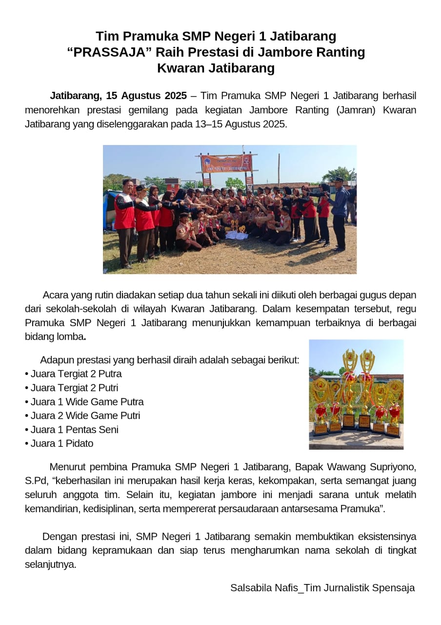 Tim Pramuka SMP Negeri 1 Jatibarang "PRASSAJA" Raih Prestasi di Jambore Ranting Kwaran Jatibarang