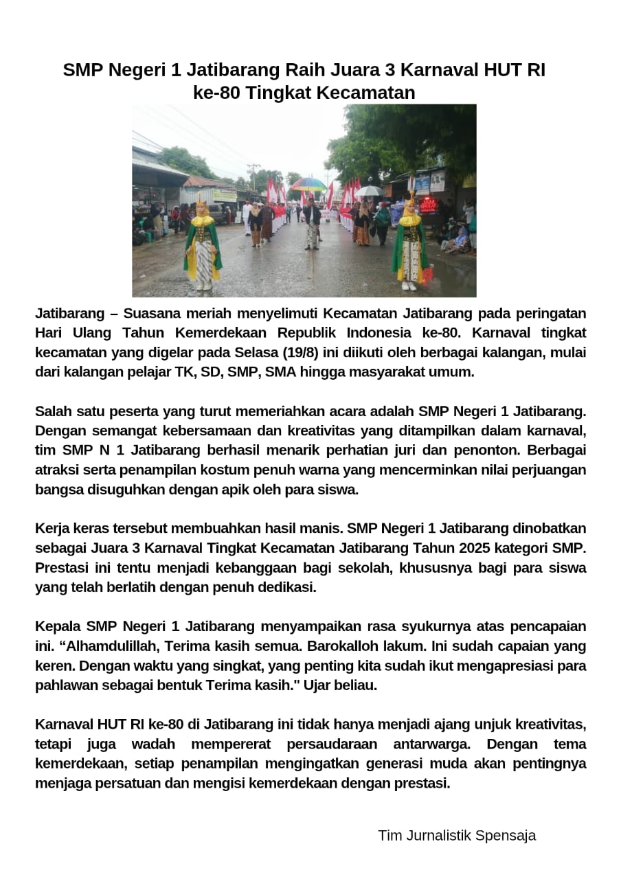 SMP Negeri 1 Jatibarang Raih Juara 3 Karnaval HUT RI ke-80 Tingkat Kecamatan